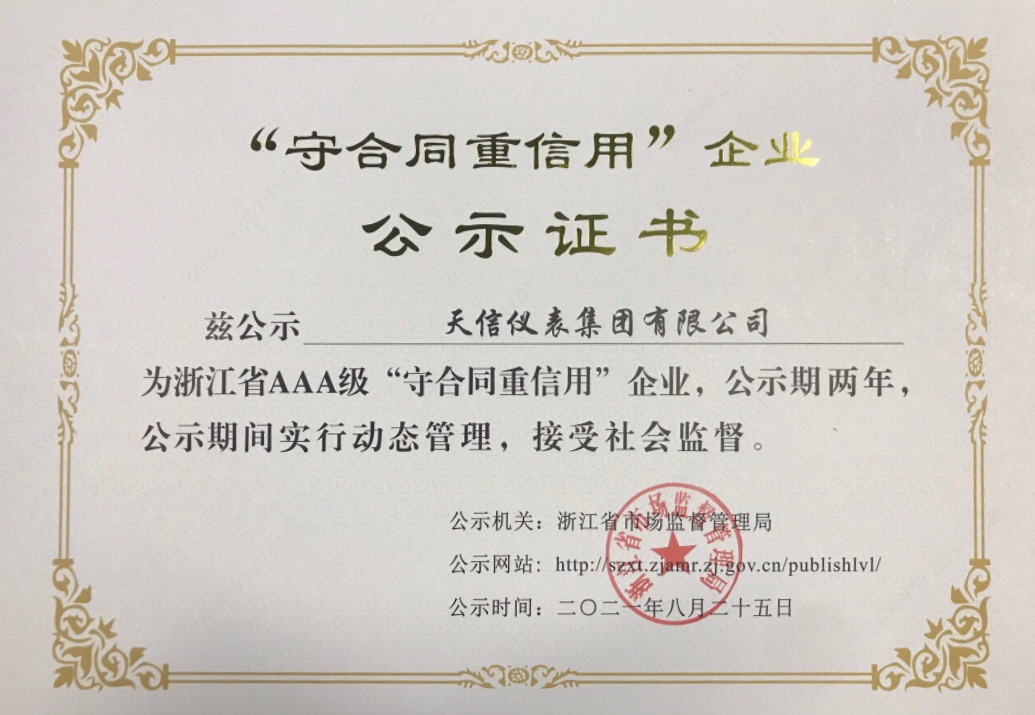 浙江省AAA級(jí)“守合同重信用”企業(yè)證書(shū)