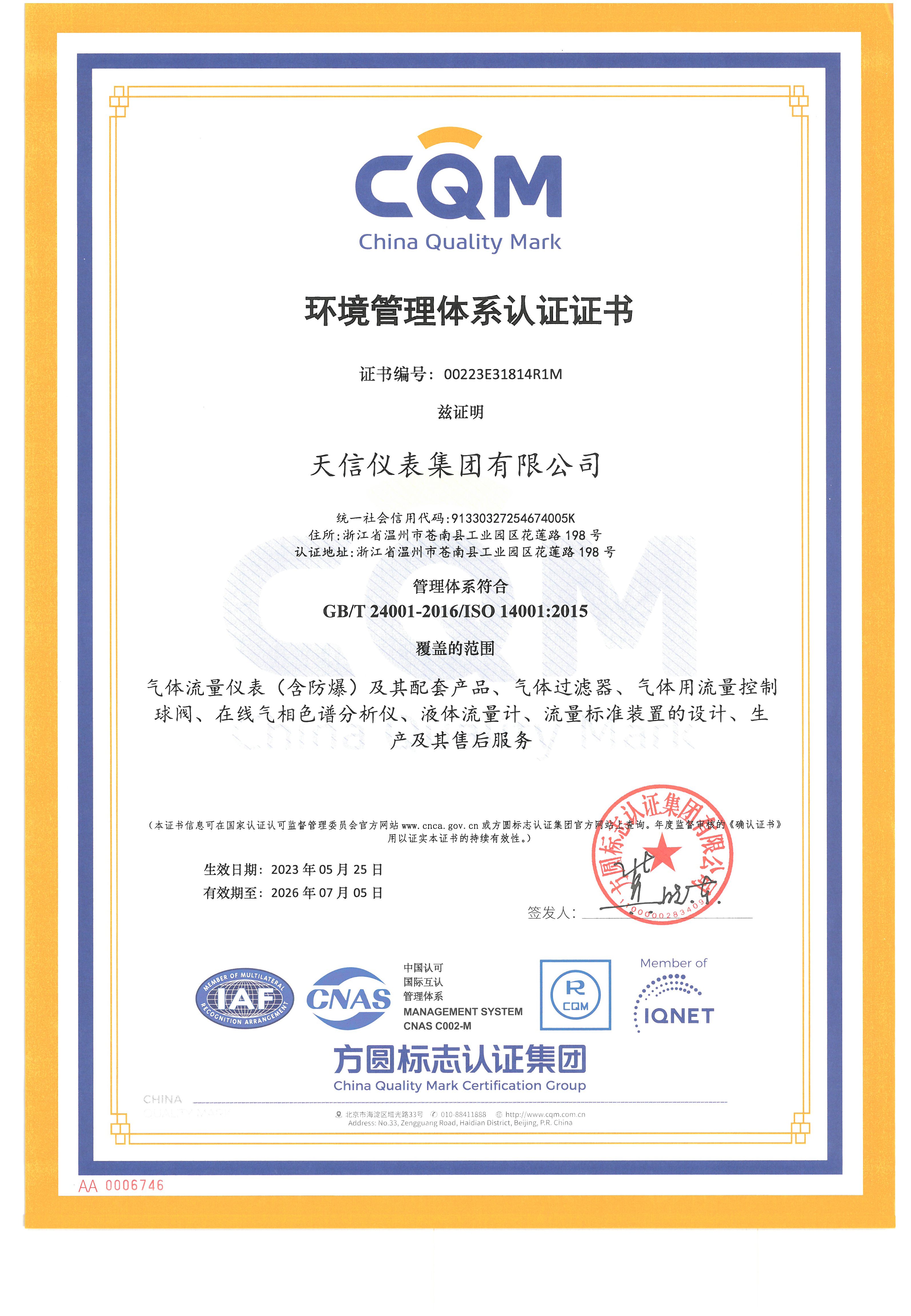 環(huán)境管理體系認(rèn)證證書(shū)