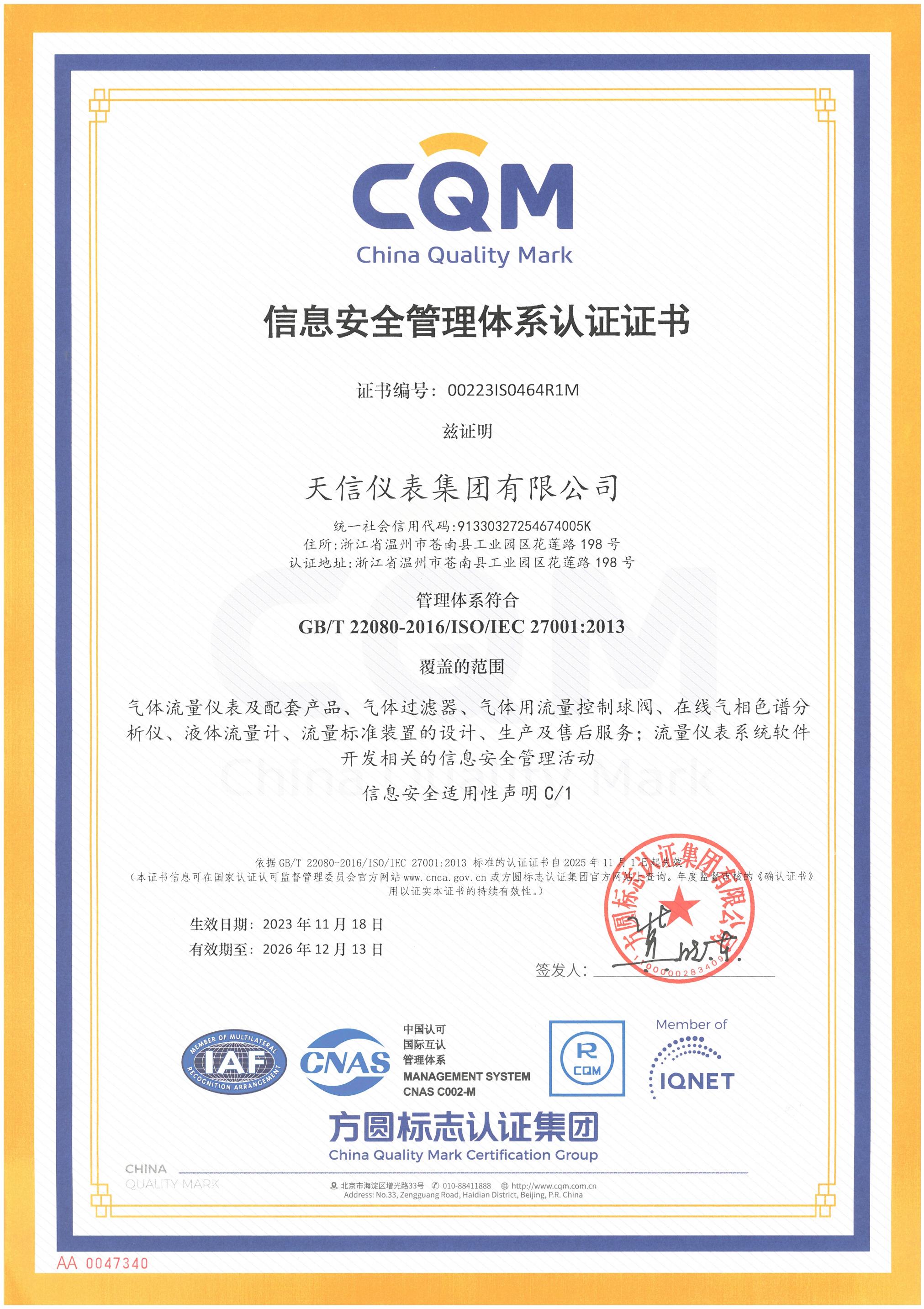 信息安全管理體系證書(shū)